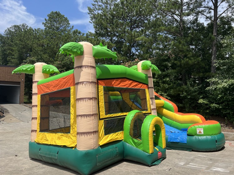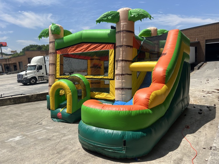 Bring island vibes to your event with this all-in-one Tropical Combo. Designed for fun and active play, it combines a spacious bouncing area with engaging features that keep kids entertained for hours. Bright, tropical colors and palm-tree accents create a festive, beachy atmosphere perfect for birthday parties, school events, backyard gatherings, or summer celebrations. Safe, durable construction provides a sturdy jumping surface and enclosed walls for added security, while an integrated slide adds excitement and variety to playtime. Easy to supervise and suitable for a range of ages, the Tropical Combo delivers lively entertainment and a memorable focal point for any party.
